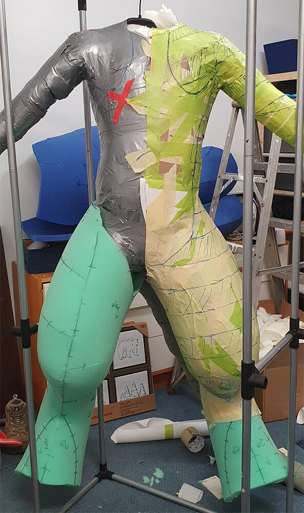Foam shell inserts are patterned pieces of 1″ upholstery foam glued together to create forms around the wearer held by tension and friction. Super lightweight and collapsible, industrial fans can blow right through to cool without needing to de-suit during breaks. For clients who prefer more solid forms pillow padding with polyester fiberfill is available but will add weight and heat. Be sure to unpack and let your foam inserts return their form a few hours before you plan to wear your costume.